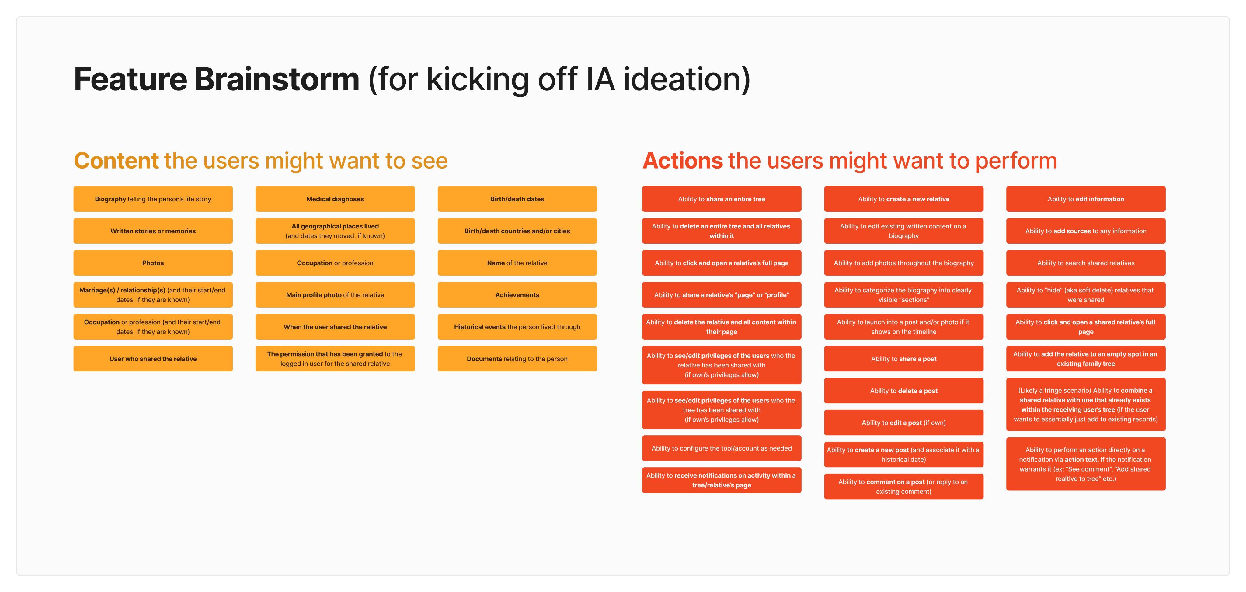Afterwards, we felt we were ready to start brainstorming what actual features and content we wanted to include in the solution.We started by brainstorming the content we wanted to include, and the actions we wanted to make available to users.