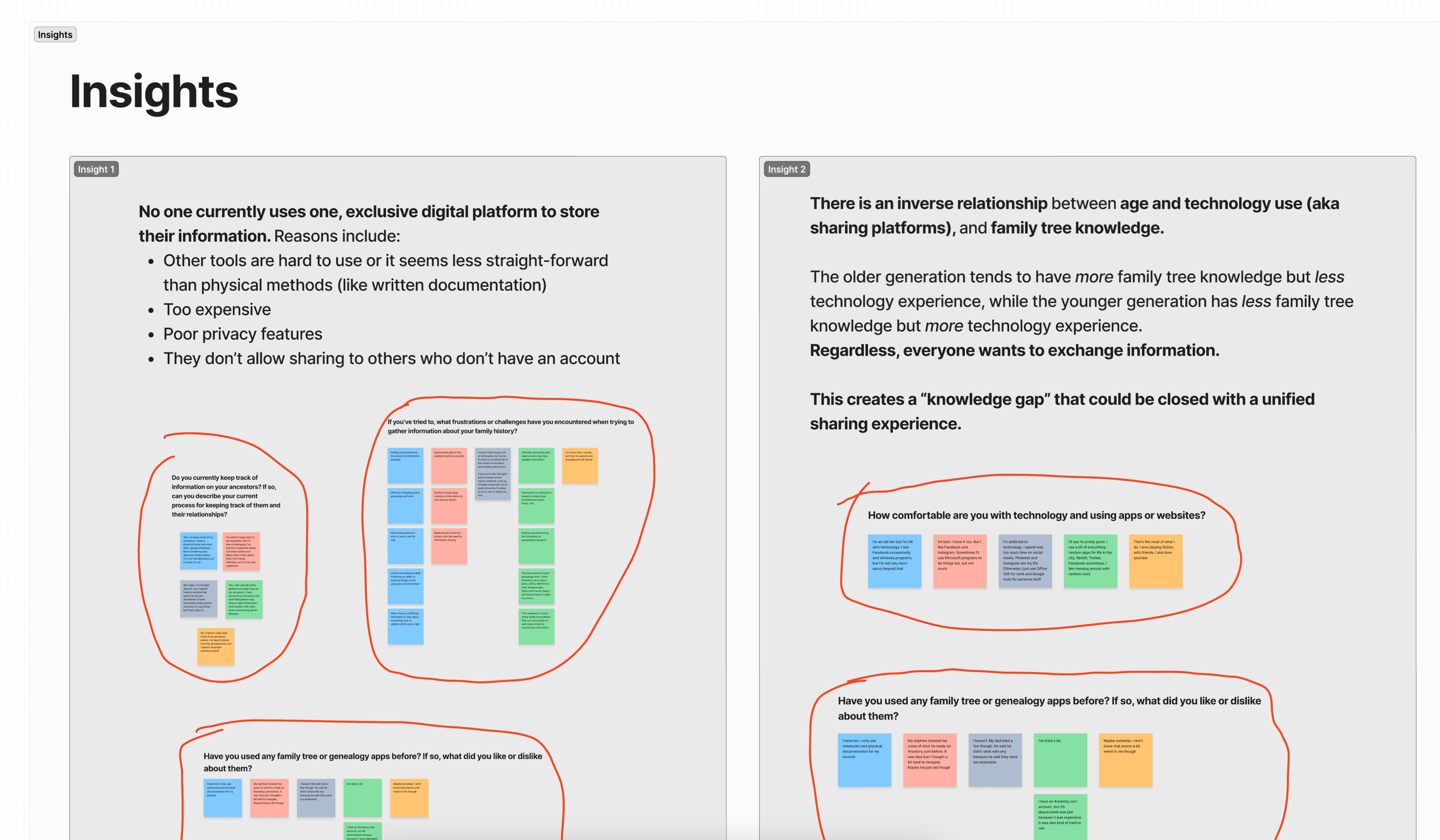 A handful of screenshots previewing the insights gathered and which interview questions/responses they were generated from.