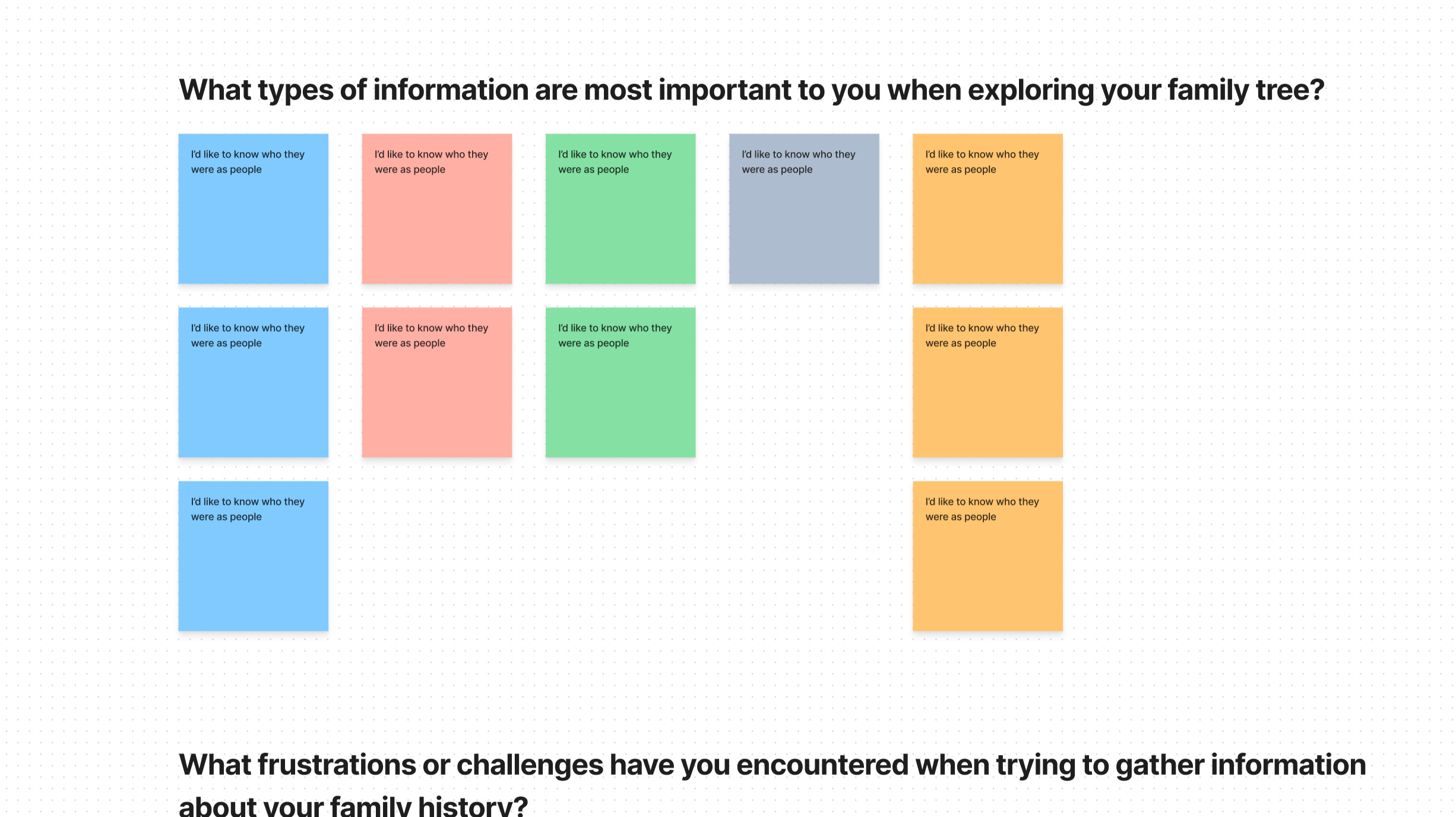 A handful of screenshots of the summarized responses recorded in FigJam from each interviewee. Each color represents a different interview, and each sticky note represents a unique answer/response.